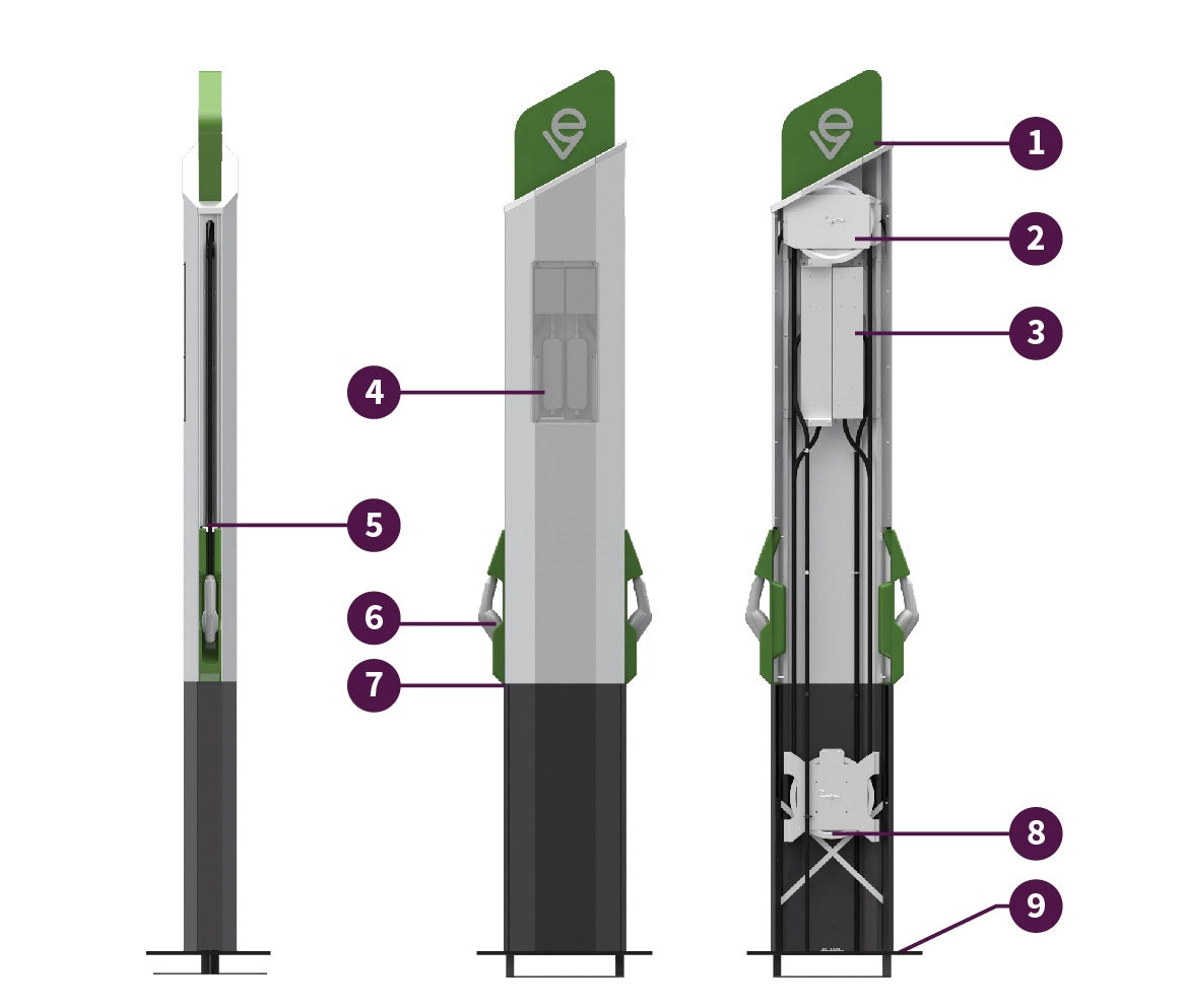 Contenant deux chargeurs de niveau 2 pouvant atteindre 11.5 kW chacun et un système de rappel du câble unique - le tout dans un boîtier ultra durable en aluminium et en acier inoxydable - la station Evera est équipée pour vous offrir de nombreuses années de service sans tracas, autant durant la belle saison que pour les durs mois de l'hiver.